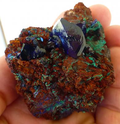This azurite specimen comes from Sardinia and features deep blue and razor sharp azurite crystals to 19 mm perched on matrix! The quality is great and very uncommon for this locality. There is no damage on any of the crystals, and some malachite attached at the side provides a very nice colour contrast!