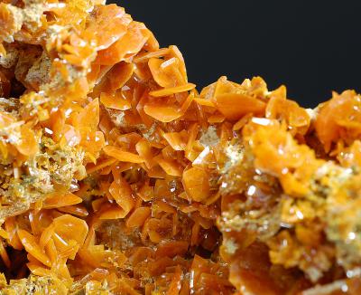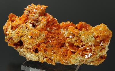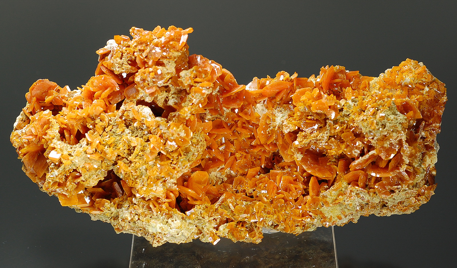 This piece features an elongated matrix almost fully covered by lustrous, orange wulfenite crystals. The piece is very 3-dimensional, and almost all of the crystals are in perfect condition. Great display and visual impact!
