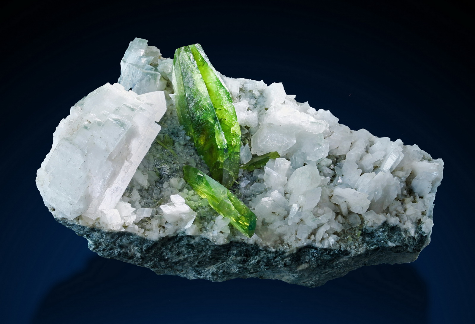 Bright green titanites perched on white adularia matrix! What a striking combination! From an old find, made by Rupert Hochwimmer. No damage.