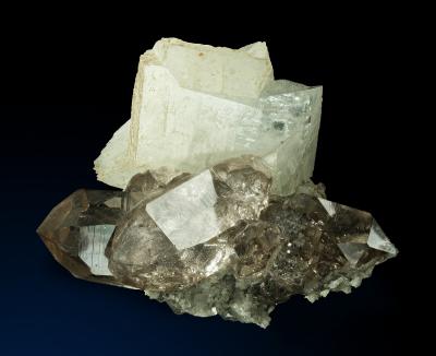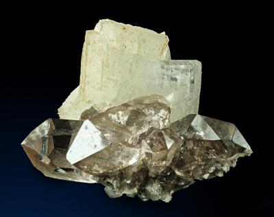 Lovely twinned adularia crystals perched on clear smokys. Very showy all around, no damage.