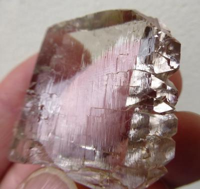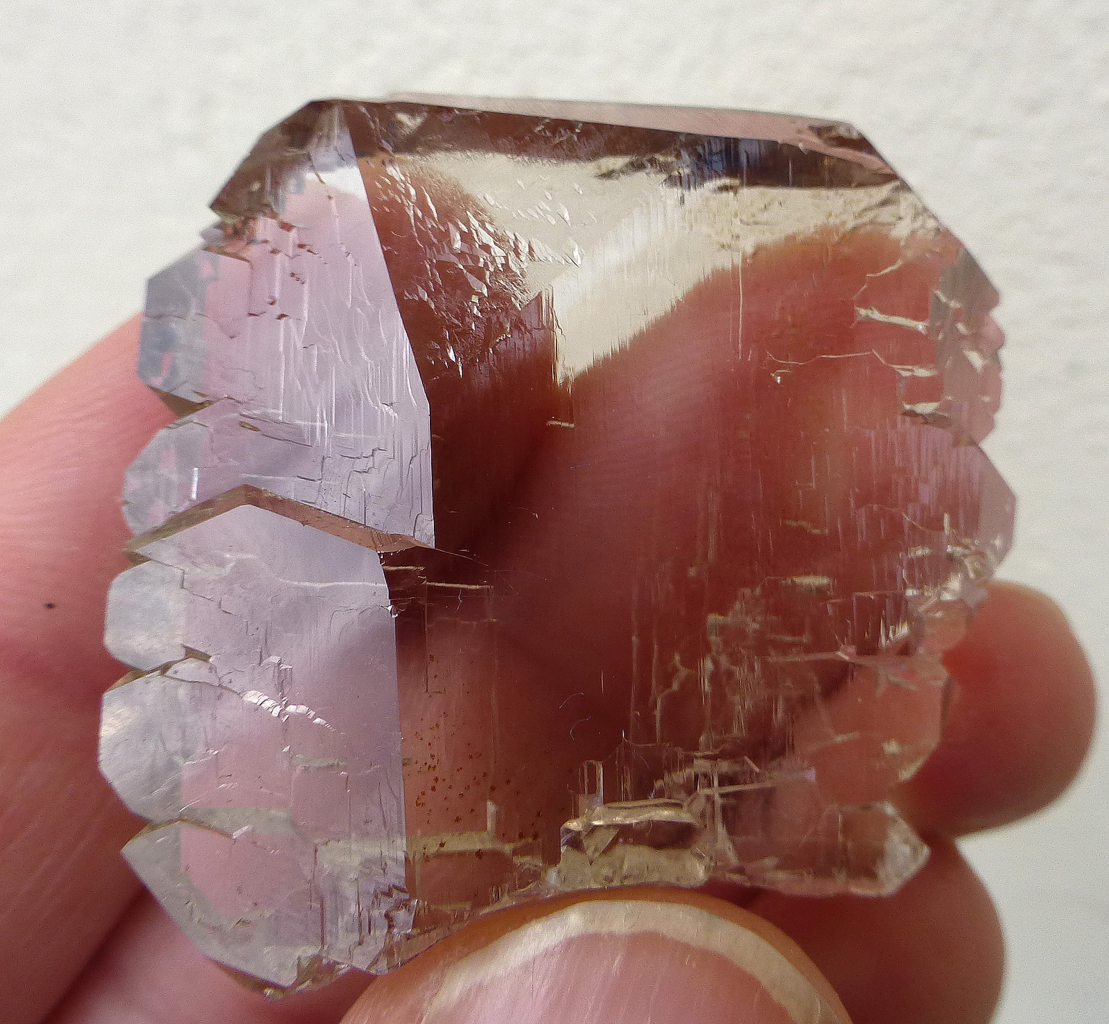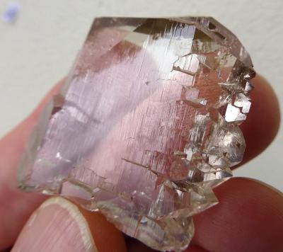 A really large, water-clear gwindel in light smoky color. The specimen shows a significant rotation, the termination is very sharp and the faces are very glossy. Only the tips show just a powder of chlorite, which helps to give more contrast to the piece. Hard to photograph, better in person! The dimension is remarkable and the quality is very good also backside. No damages, no contacts!