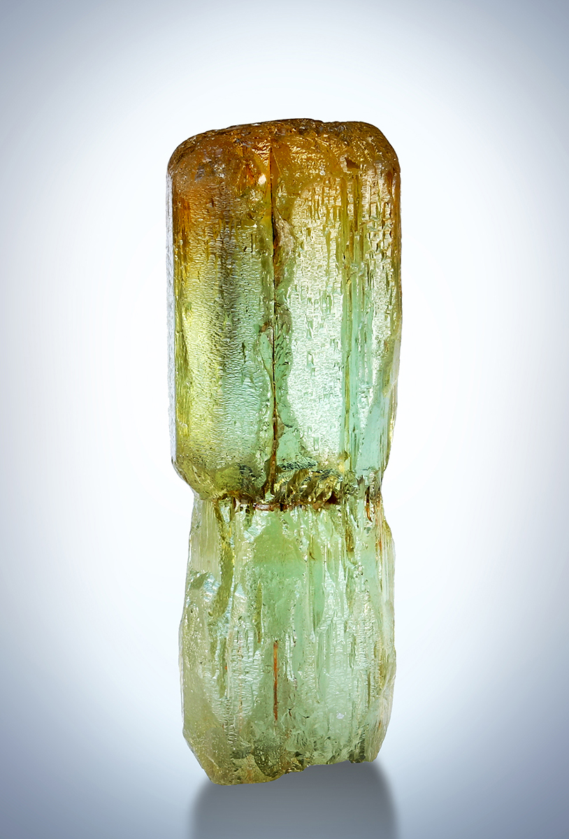 These beryls were mined in the late 1970s and some were hoarded by the miner, Bob Contat, a geologist over there at the time. But there was never much quantity and today they are very, very uncommon, rare and immediately recognizable by the color and shape. This particular specimen looks like two elongated tons on the top of each other. At the end points the color is darker, nearly orange-brown. Most of the crystal shows strong, vivid yellow. But depending on angel and light you can see also tones of yellow-green. The texture of the glossy faces is also very attractive. Well developed and on same high quality all around. No damage.