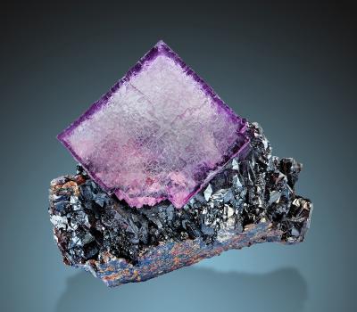 The main crystal is 29mm on edges. The faces show a really eye-catching texture, which seems to consit of hundreds tiny squares - all of them very glossy. The center is very light, just a touch of lavender. Along the edges you can see a sharp concentration of purple color. The crystal is perched on dark, lustrous sphalerite, which gives a lot of contrast and great visual impact to this excellent specimen.