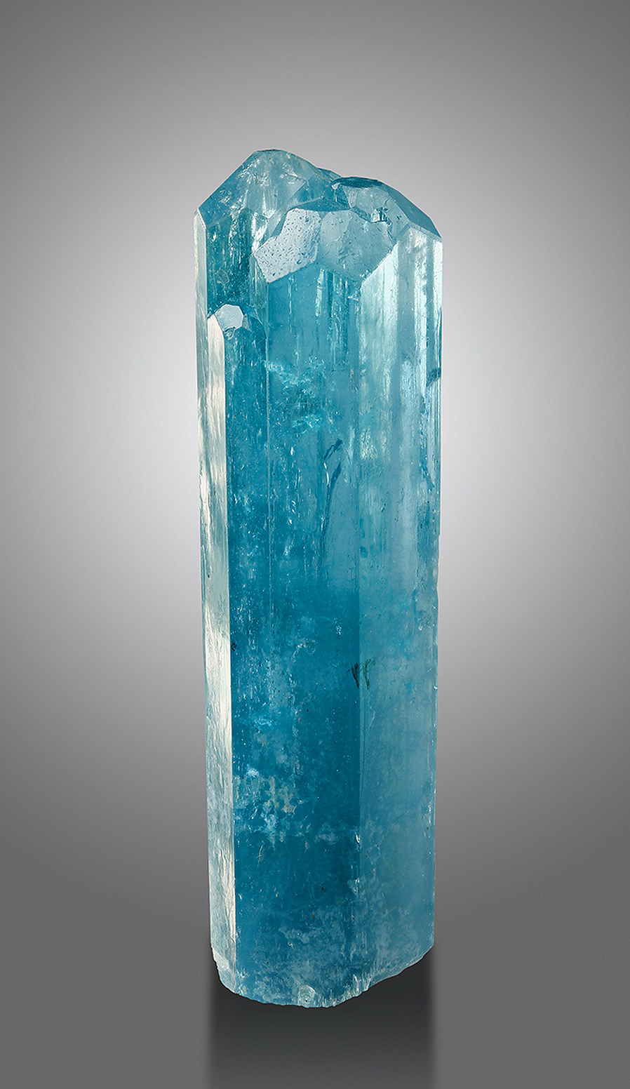 An deep blue, very colour-saturated aquamarine from more recent finds in Vietnam. The color is EXTREME, and reminds me only of a very few Jos aquamarines I have seen in the past, quite more robust than aquas from Pakistan or Brazil. This elegant, cityscape cluster of vertical crystals is complete all-around and looks great in each angle. Only a low number was found, even less were clusters like the particular piece. It is pristine and has a fancy, pyramidal termination characteristic of this discovery. No significant damages to report.