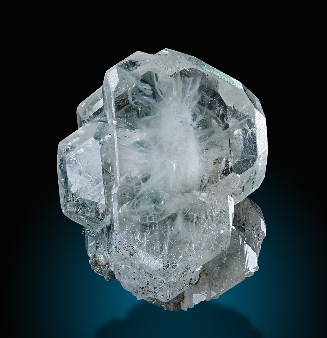 A well formed floater cluster of sharp termianted, highly lustrous apatite crystals. They show a glassy character, along the edges they are gemmy, in the center you can see a wonderful byssolite inclusion. Lovely bevels on the edges, and wonderful display from all sides. No significant damages to report.