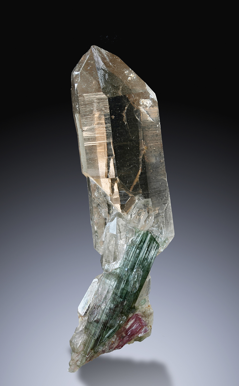 A sharp termianted and water-clear smoky quartz with dark green and intense pink inter grown tourmaline crystals at the base. A very aesthetic assemble! No significant damages to rport, bottom was extracted from the rock.