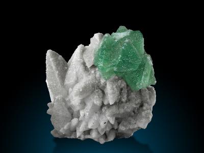 This is very rare material from an old Namibian gold mine. The calcite crystals are very light and feature a great contrast to green octahedral fluorite crystals. They consist of uncountable tiny, razor sharp steps, which are all lustrous. This specimen represents an outstanding rarity in best quality.