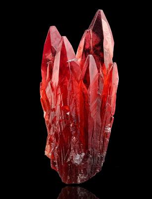 An elongated, elegant and very aesthetic group of sharp, lustrous, gemmy Rhodochrosite in fiery red color. The crystals show excellent clarity, the group looks great in various positions.