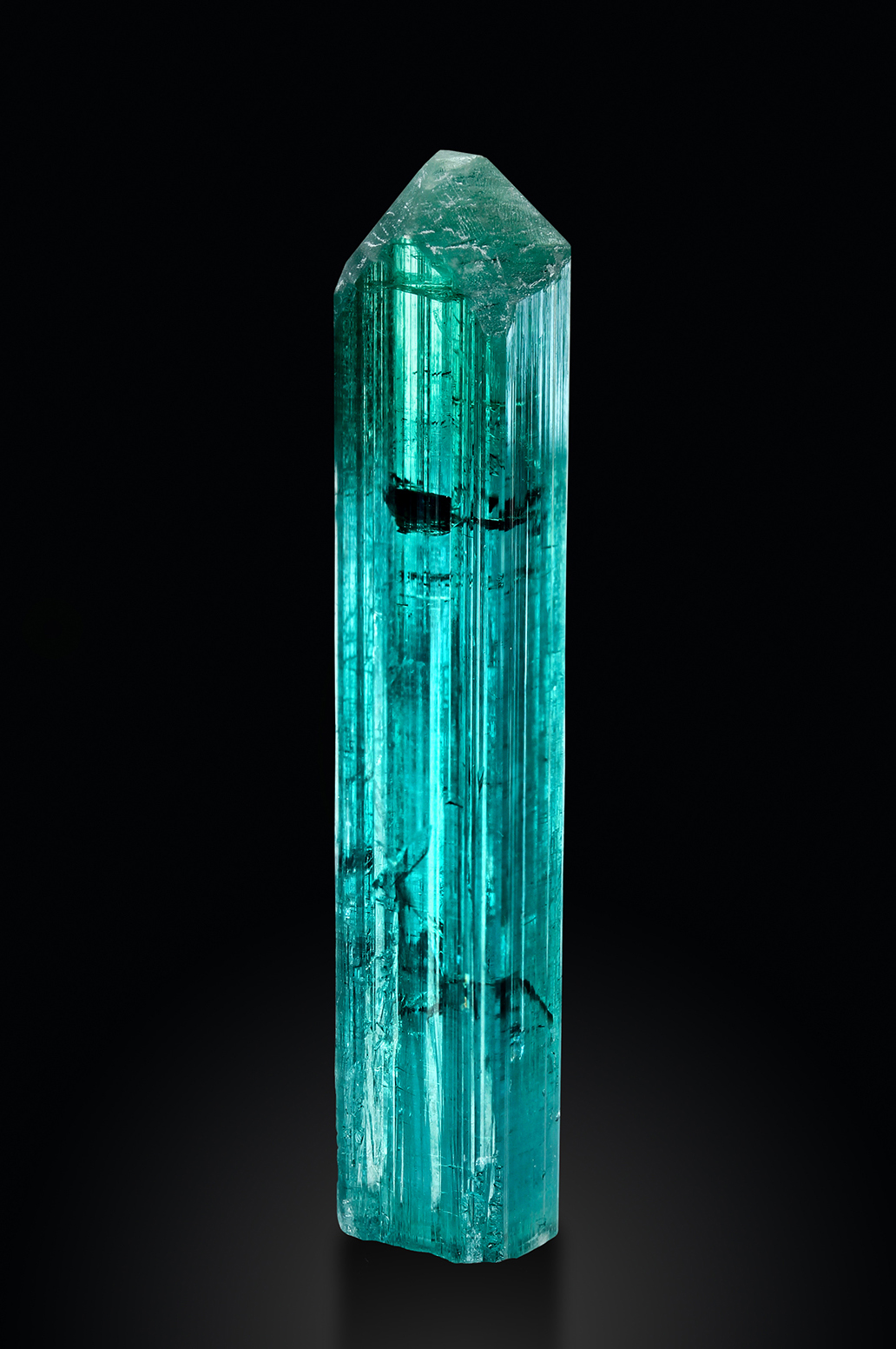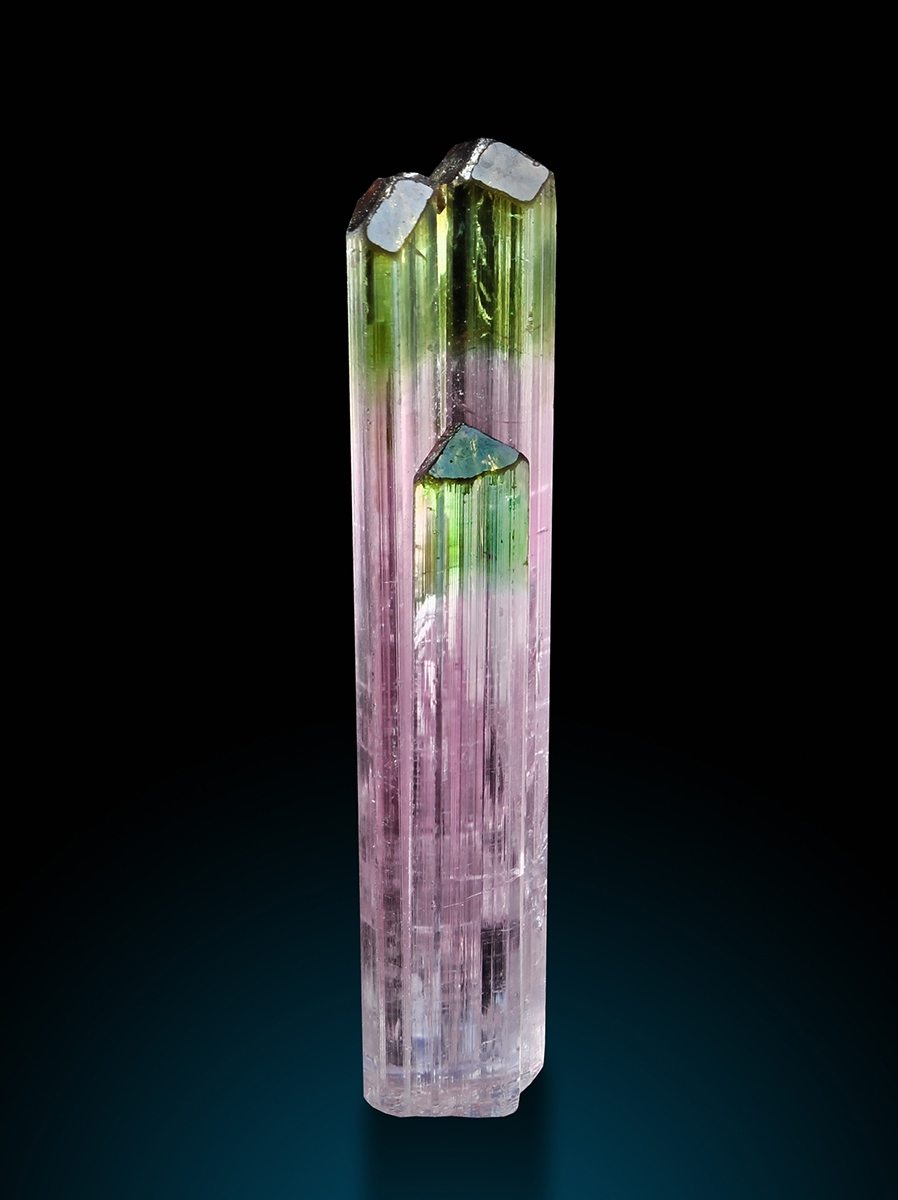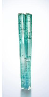 Two parallel inter-grown crystals in perfect quality: lustrous, sharp terminated and gemmy from bottom to top. They show a sky-blue color and modified end-points. No significant damages to report.