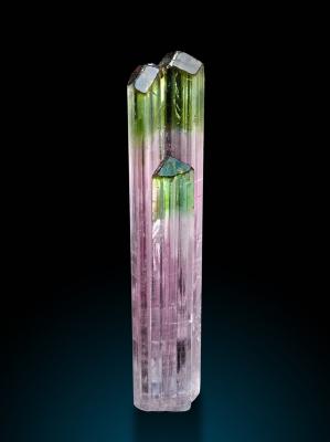 A novelty from a small discovery in 2018. The specimen shows light pink color and sharp terminated green cap. The faces are all highly lustrous, the carity is like glass - please note that it doesn´t need any backlight to show these colors; the quality is as good as it ever could be. Most specimen from this discovery were only single crystals - this one is a group of two larger crystals with one smaller in the center - this indicator makes it even more special. No significnat damages to report, bottom was on the rock.