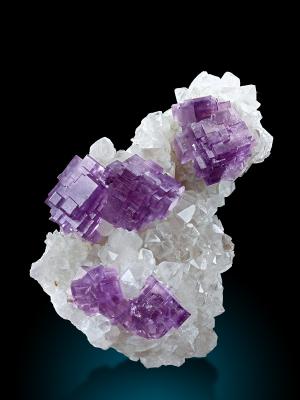 Several exposed and isolated dark violet fluorite crystals attractively set on sharp, glossy milky quartz crystals. Great contrast, very aesthetic and in excellent condition.
