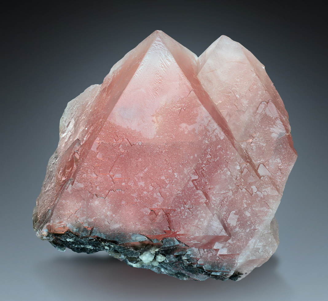 WOW! What a large rosafluorit cluster from renowned Göschener valley. Two large pyramids are attached to each other and make a wonderful composition. The bottom side is covered by chlorite, minor granite is present in places. Great condition and impact!