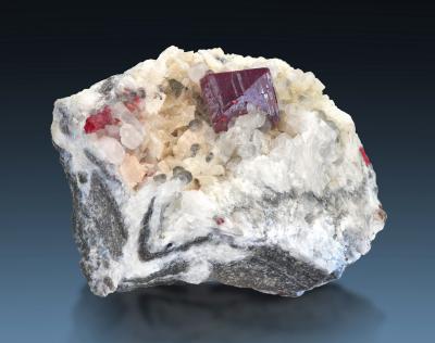 A beautiful cinnabar crystal sizzing on dolomite and quartz matrix. The crystal measures 1.7 cm across. Ex Oliver Konczer collection.