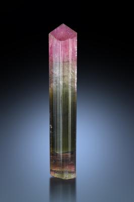 A great example of a liddiocaite crystal from Madagascar, gradually descending from a bright pink coloration of the uppor portion of the crystal through light greenish gray to dark green closer to the base of the crystal.