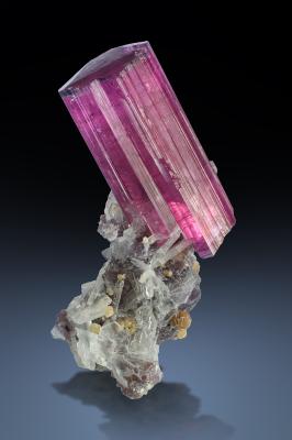 A stunning, gemmy miniature rubellite attached to matrix from the world famous Cruzeiro mine. The specimen is indeed a very elegant miniature.