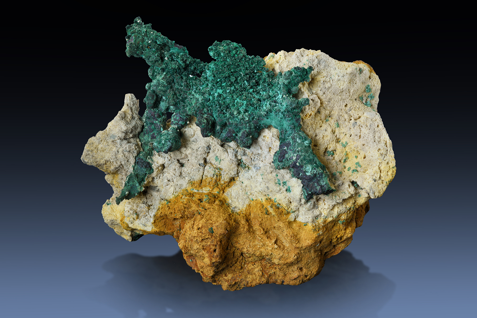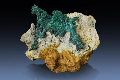 A rich cluster of Hungarian copper coated with secondary copper minerals exhibiting green coloration of the surface. The copper is nicely contrasting with its host rock. A very nice addition to a collection of native copper or Hungarian minerals.