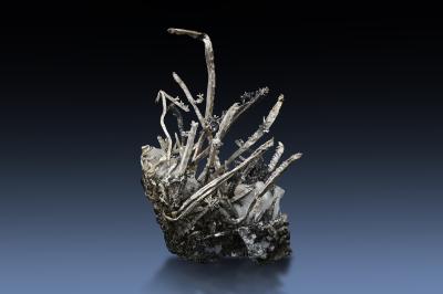 A rich cluster of silver wires perfectly balancing like an orchestrated dance scene. The individual sharp silver wires have a clean surface and strong metallic luster. A perfect Mexican silver miniature.