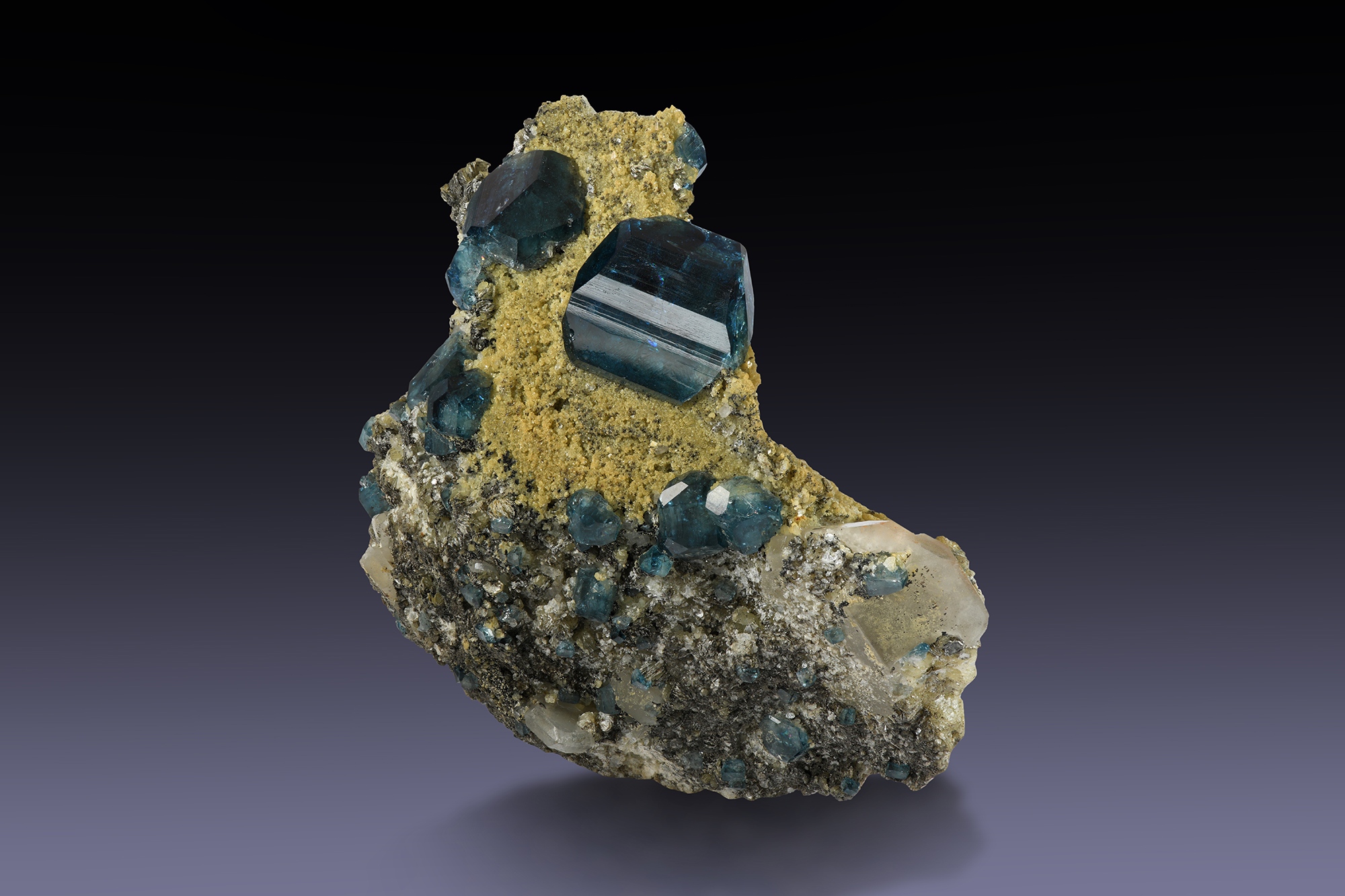 A sharp teel blue apatite crystal with several smaller crystals neatly imbedded in matrix, originating from Golconda Mine, Minas Gerais, Brazil. Ex Alfred Haas coll.