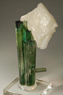 This is beautiful spray of blue-green tourmaline crystals, a white albite crystal is sitting on top.