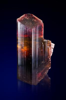 This is a large multicolour liddicoatite crystal with an amazing red cap and nicely bevelled termination faces. The colour will show up best when backlight (as shown on the pictures above). Aside the wonderful colours, the pcrystal features very nice striations on the prism faces and is in very good condition all around.