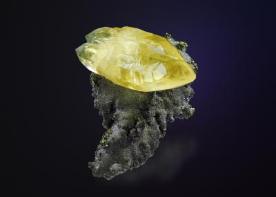 This specimen features a twinned, thick and massy cerussite crystal perched on a shard of calcite matrix which is covered by small mimetite, malachite and probably also duftite crystals. The piece is actually a floater and in perfect condition all around. Also, the piece has great visual impact and it is truly a great small cabinet sized sample of the species. Ex Steve Smale collection.