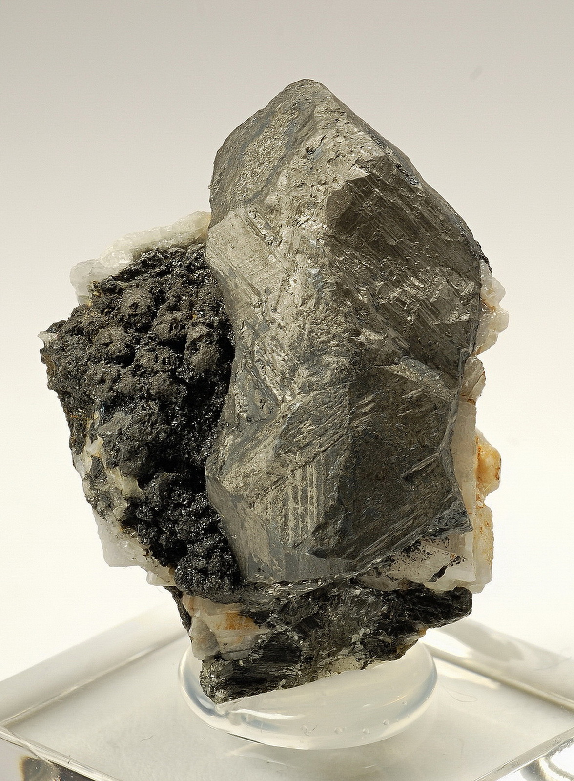 Large and well-shaped dyscrasite crystal on calcite matrix. The associated mineral on the left side is most likely pyrargyrite. Very fine and rare!
