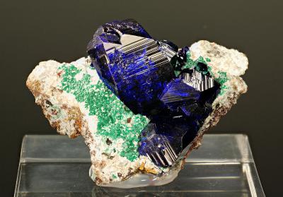 What a gorgeous miniature! Deep blue azurite crystals sitting on a matrix covered with starkly contrasting rosasite crystals. The piece shows impressively the quality and style of azurite Tsumeb is so famous for. Great aesthetics and composition!