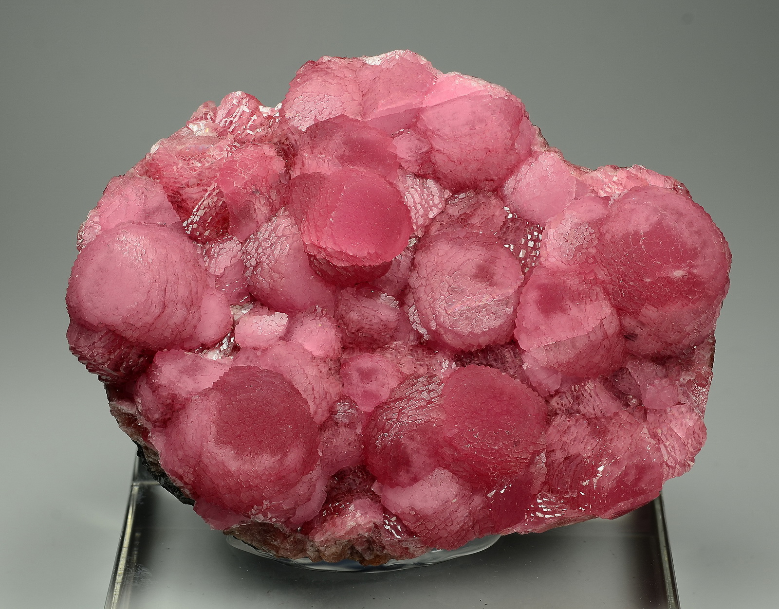 This is a wonderful specimen featuring more than a dozen botroidal aggregates of raspberry coloured rhodochrosite from N'Chwaning mine. Only very few specimens of this special style have been recovered! No damage.