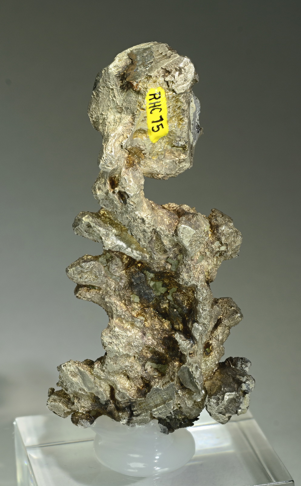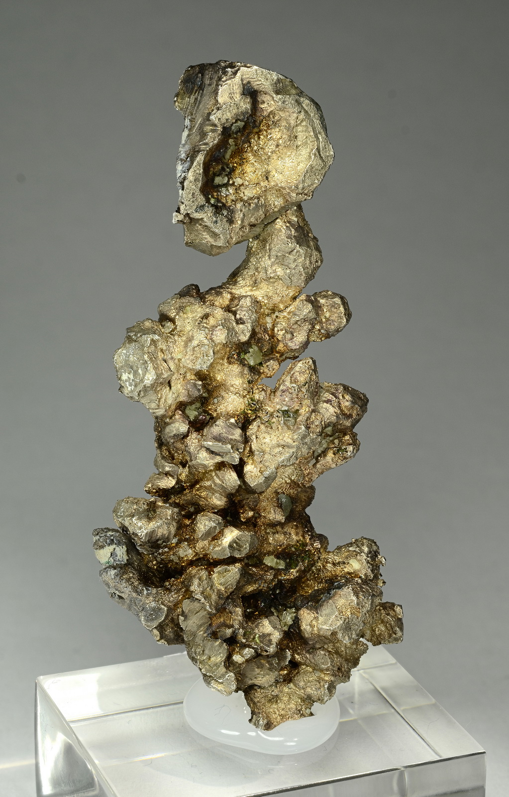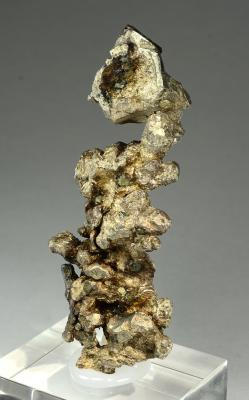 AThis specimen features an one inch silver crystal stacked on a cluster of smaller ones. The entire specimen is massive silver and has a very fine reddish patina. It comes with an old label stating it was found in 1963. Superb quality for the advanced silver collector!