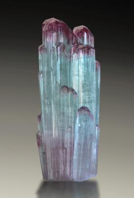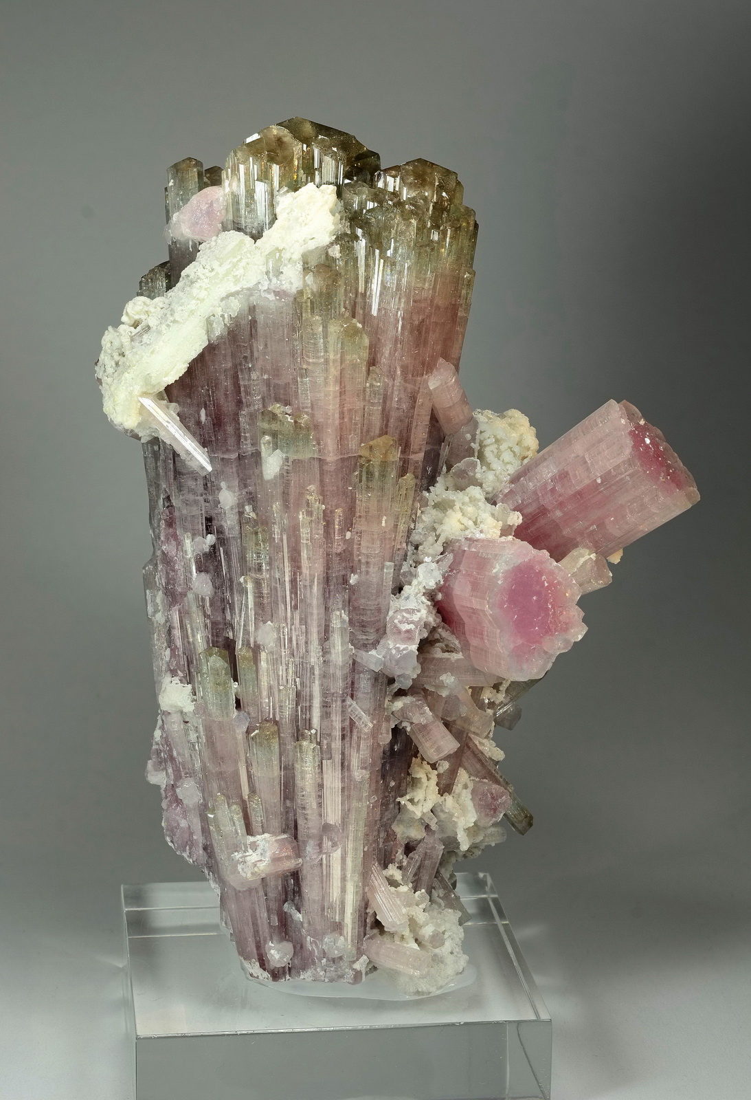 Gorgeous large cabinet cluster of pink and green cap tourmalines from an old find in Darra-i-Pech. The two large and freestanding side crystals, forming a V, and a couple more crystals scattered around make this truly an outstanding specimen! Great condition, and very showy from all sides. 1.45 kilograms, no repair!