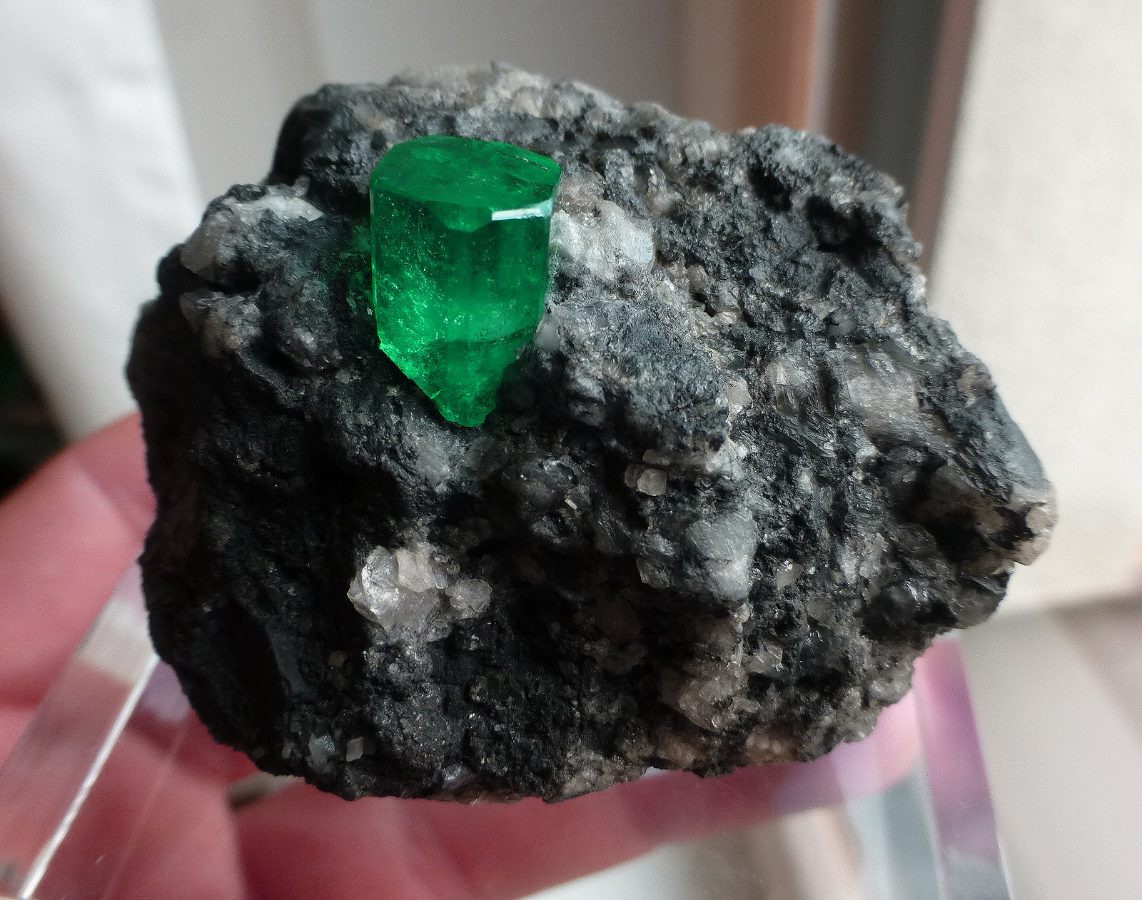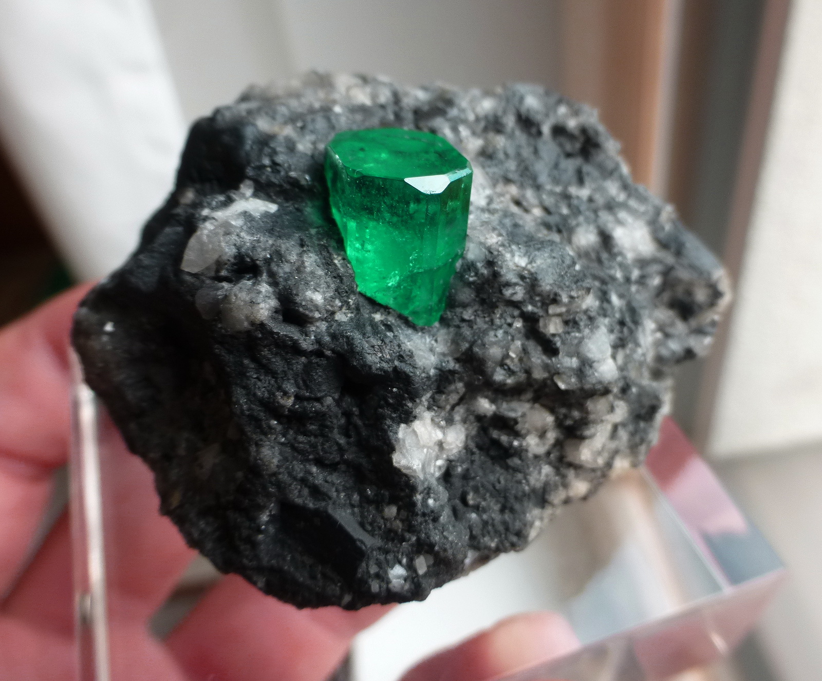 WOW! What a superb, glassy and deep green emerald crystal in calcite matrix. The emerald measures 14 mm in height and is free of any damage.