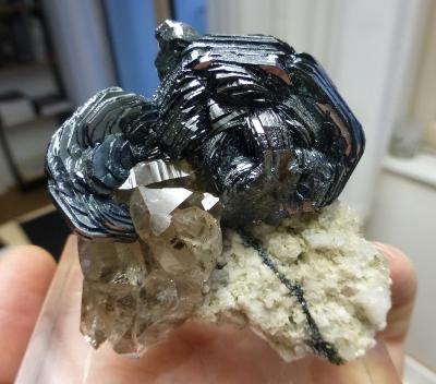 WOW!!! This is the most aesthetic and most beautiful ironrose i have ever seen from any locality in the Alps! Two rosettes are perched atop white granite matrix, and several brilliant smoky quartz crystals set a beautiful contrast. the luster is brilliant like a mirror on all crystal faces. From the famous Clapasson pocket on Schafberg, Furka region. Indeed a masterpiece creation of mother nature!