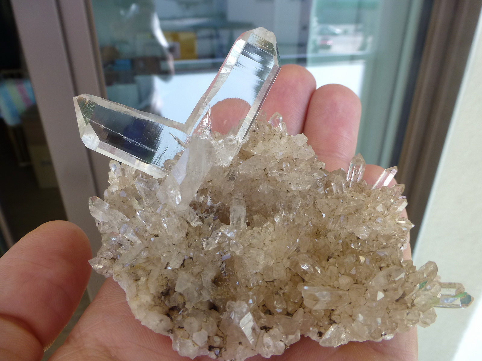 WOW! A fabulous 8 cm gwindel and a regular quartz crystal are sitting right in the centre of a quartz crystal gruop. All crystals show incredible luster, truly the very best one can look for, and amazing clarity. The colour is a very appealing medium smokey hue, not dark and not light, very beautiful and eye candy! The specimen got detached from the granite wall still in the pocket during a late period of growth, hence the bottom side is fully recrystallized. It even shows some adularia and rutile sagenite crystals. The entire specimen is in fantastic condition and shape all around - truly a masterpiece of highest standards!