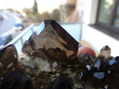 WOW! What an amazing closed gwindel on matrix! A 3 cm closed and fully pristine gwindel sits in the centre of a 5 inch wide matrix that is richly covered by many sparkling smoky quartz crystals. The quality is indeed striking! One of the best closed gwindels i have seen from the famous Rufibach pocket. No damage.