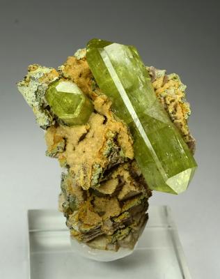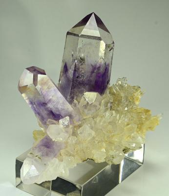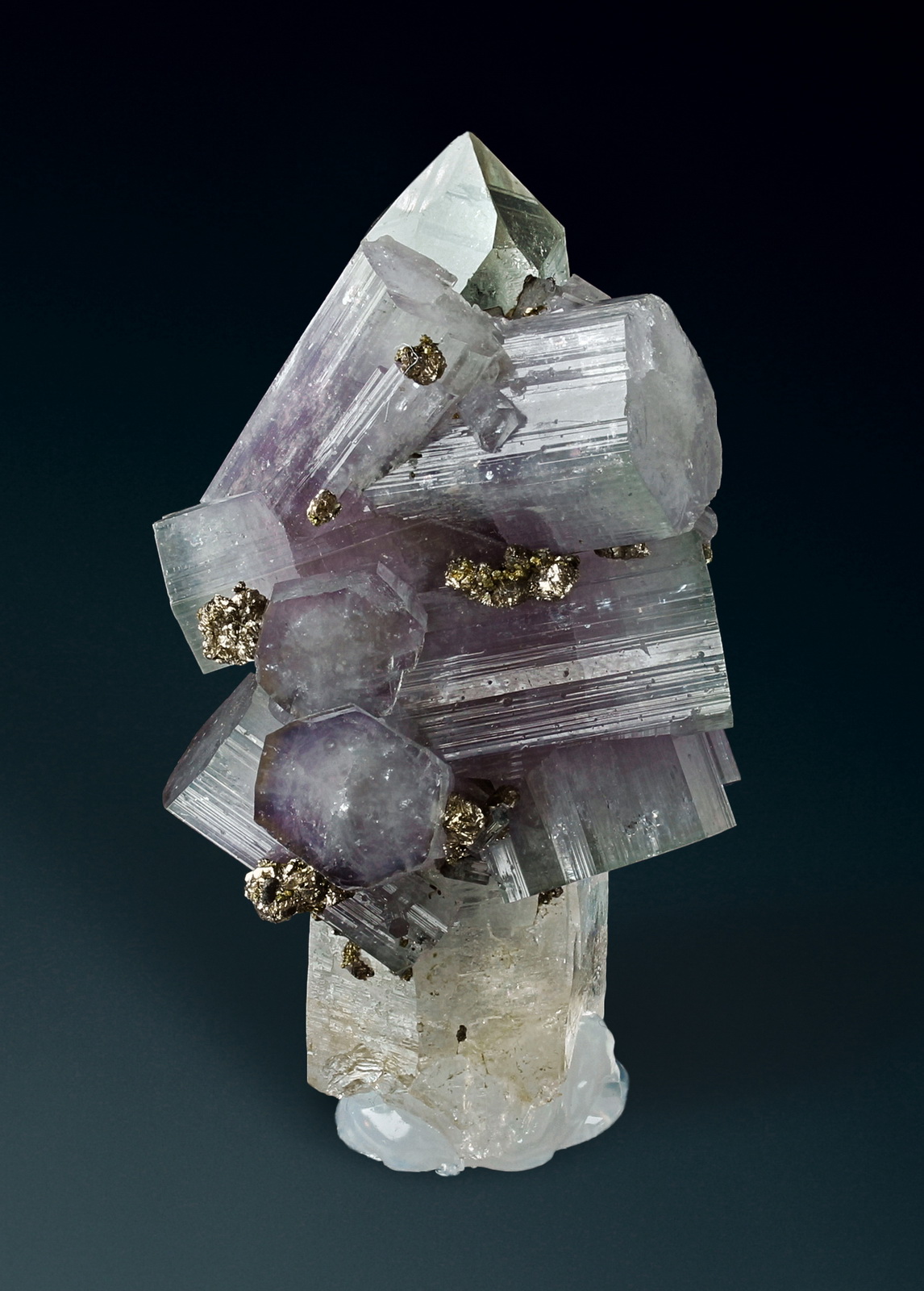 Fantastic bi-colour apatites and chalcopyrites perched on a single quartz crystal.