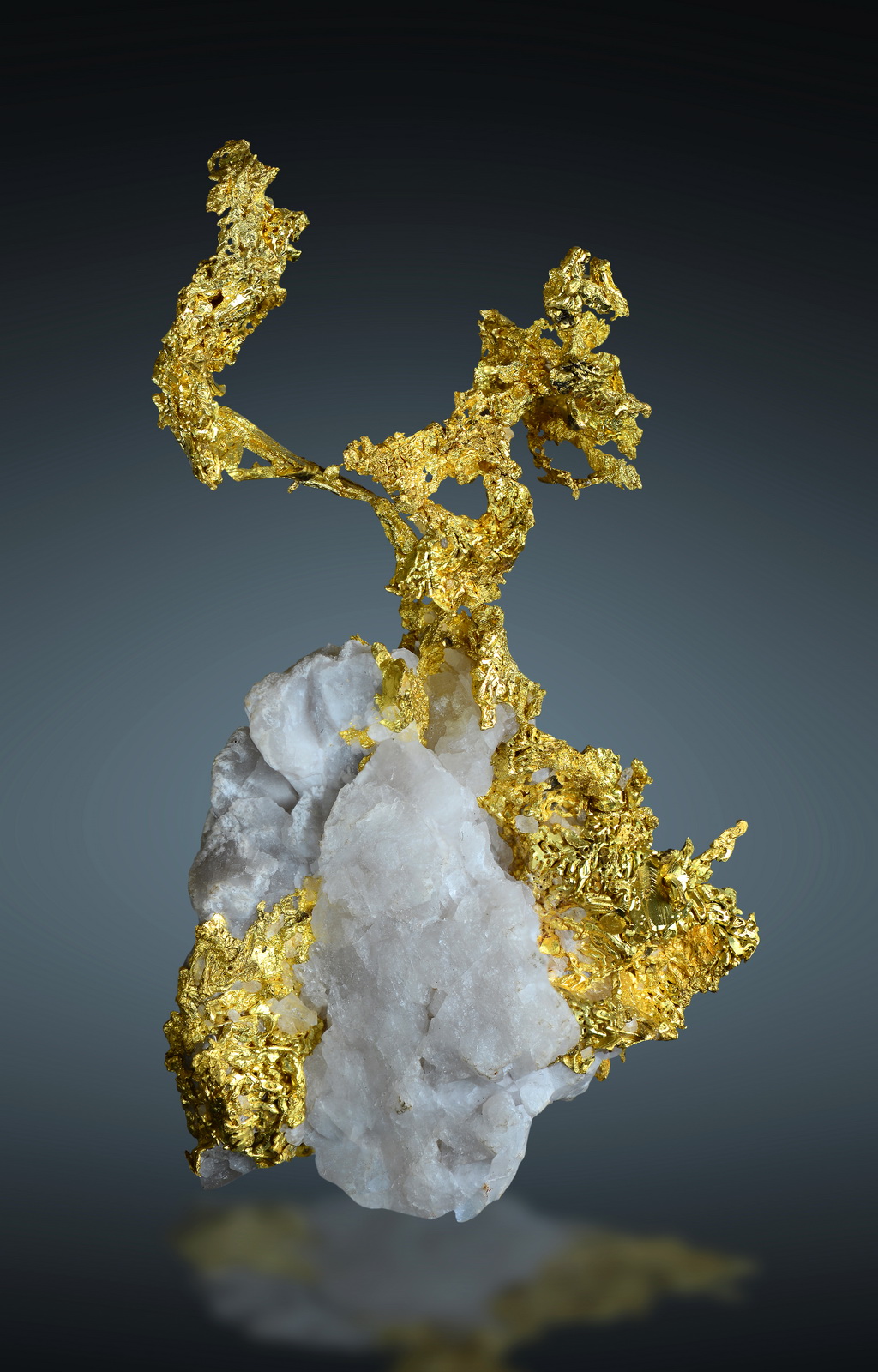 WOW! Highly lustrous gold crystals on quartz matrix. This is an exceptionally well-formed sample from this famous locality. Perfect condition, and very showy all around!