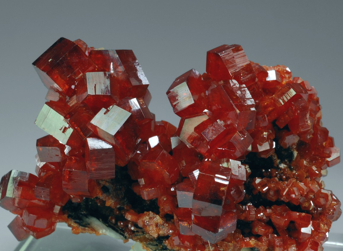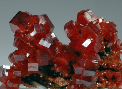 Deep red vanadinites on nicely contrasting baryte crystals.