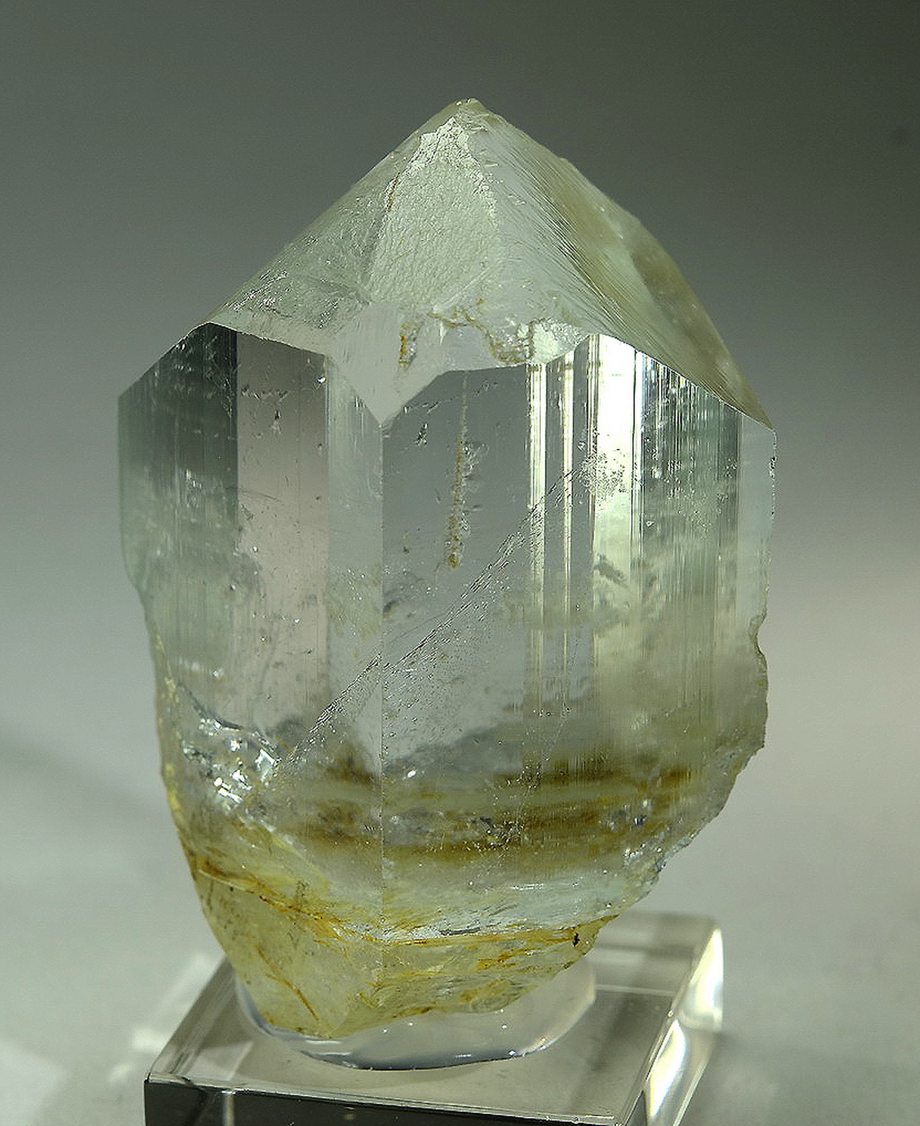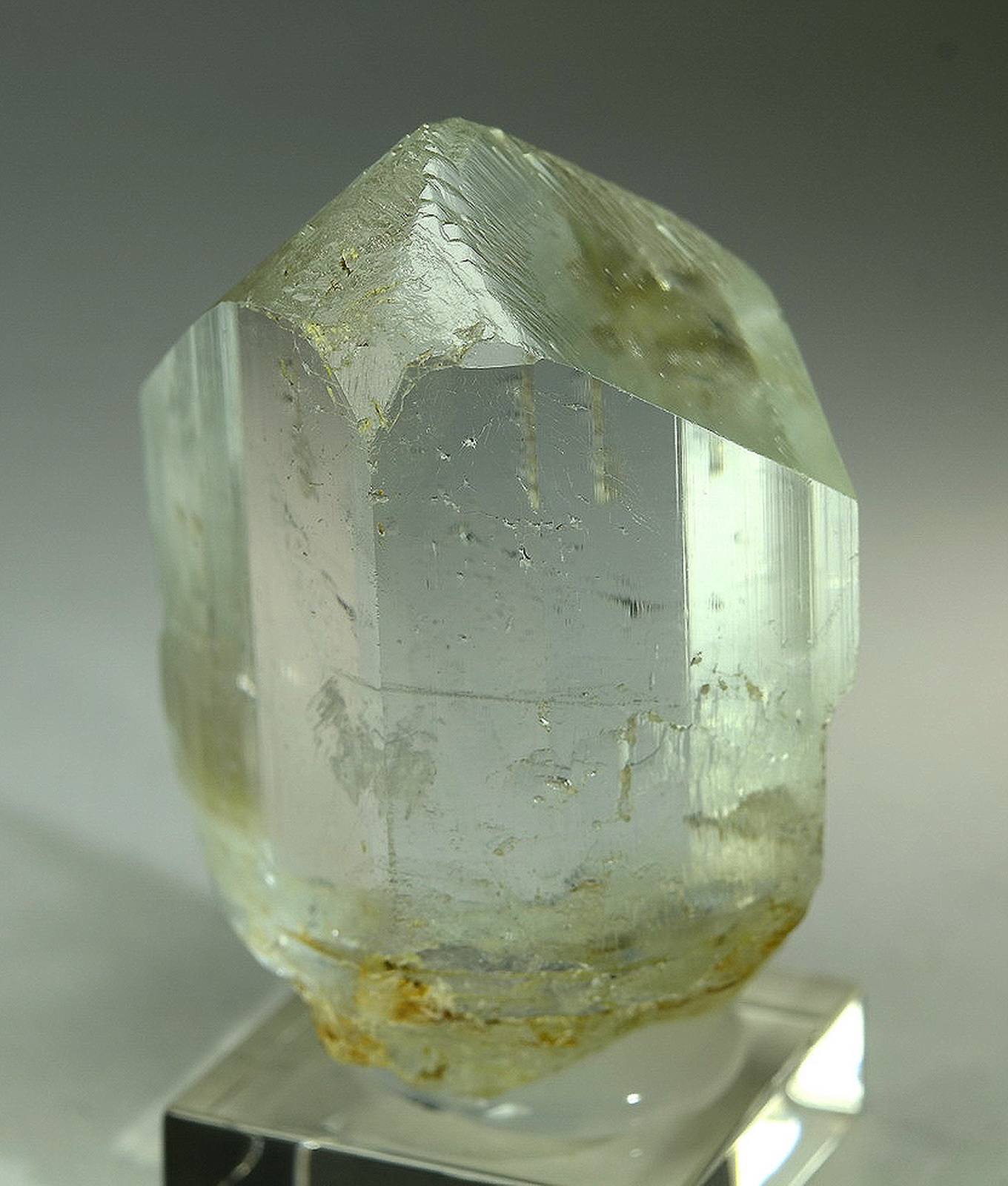 Clear and lustrous topaz crystal featuring special etching patterns twoards the upper termination. The colour is actually a very light blueish tone, the yellow hue in the bottom section results from limonite inclusions.