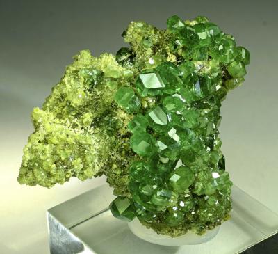 Gemmy and lustrous demantoide crystals in a beautiful cluster on matrix. The centre group of two crystals is exceptionally bright, totally clear and also very exposed. Actually it is perched totally freestanding on the smaller crystals below. The sparkle on this specimen is indeed amazing in person, the pictures sadly fail to show the outstanding quality and compsition. Much better in person. No damage.