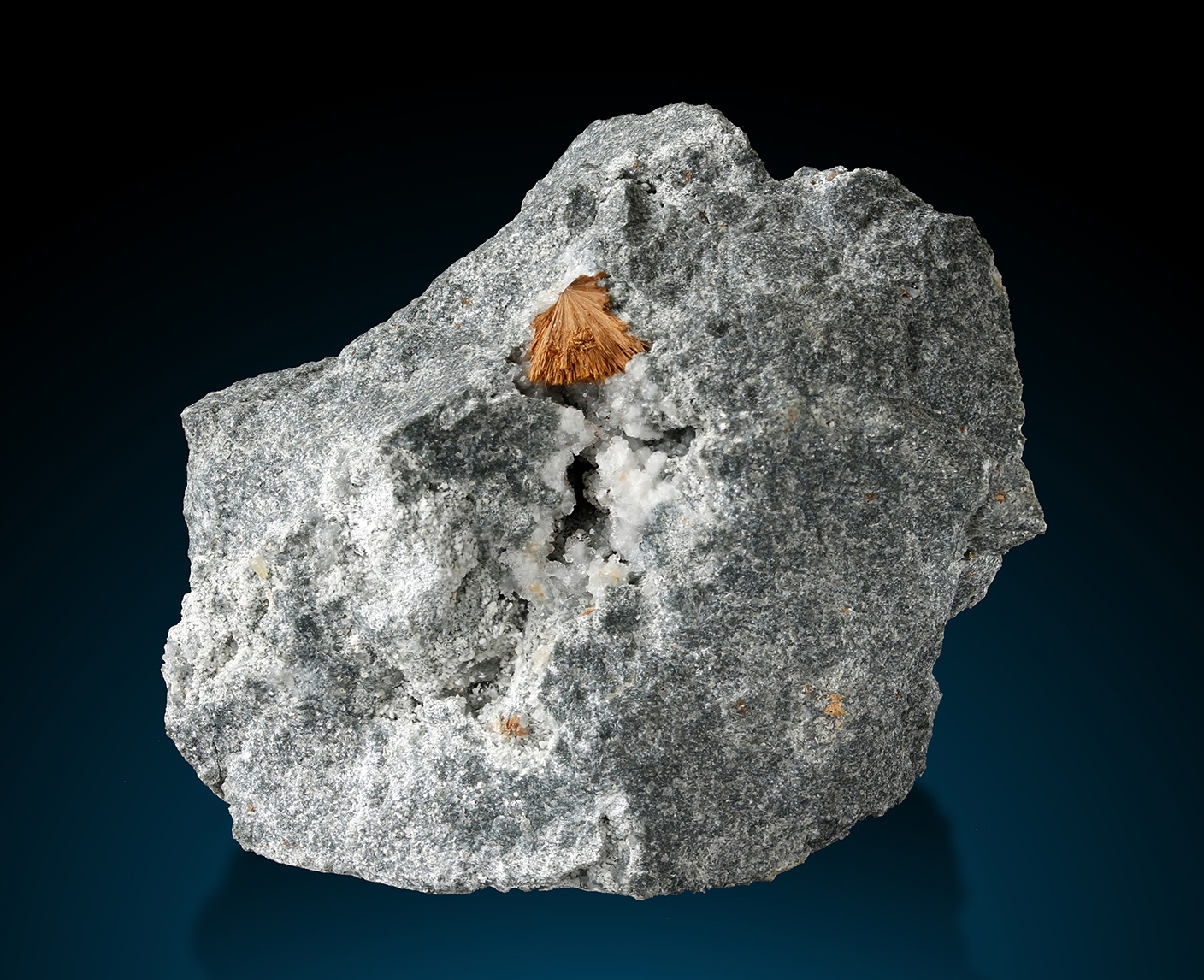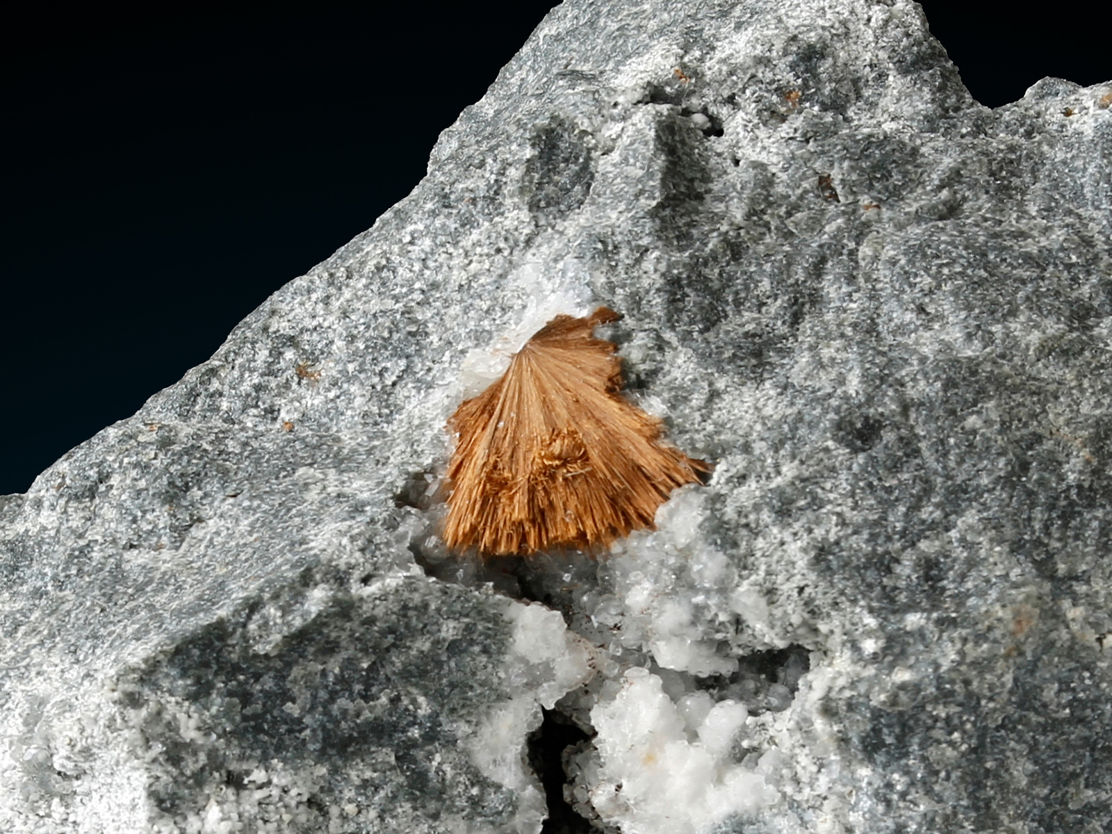 The radial spray of Tuperssuatsiait is 12 mm across, set in the center of matrix. This rare species is a red-brown monoclinic mineral comprising mostly iron, silicon, and oxygen. Very hard to obtain and 12mm is a fairly large size for this scarce mineral! Back side was sawn, but can easily be made look more natural in a professional lab, if desired. There is another vug featuring a 9 mm crystal spray.