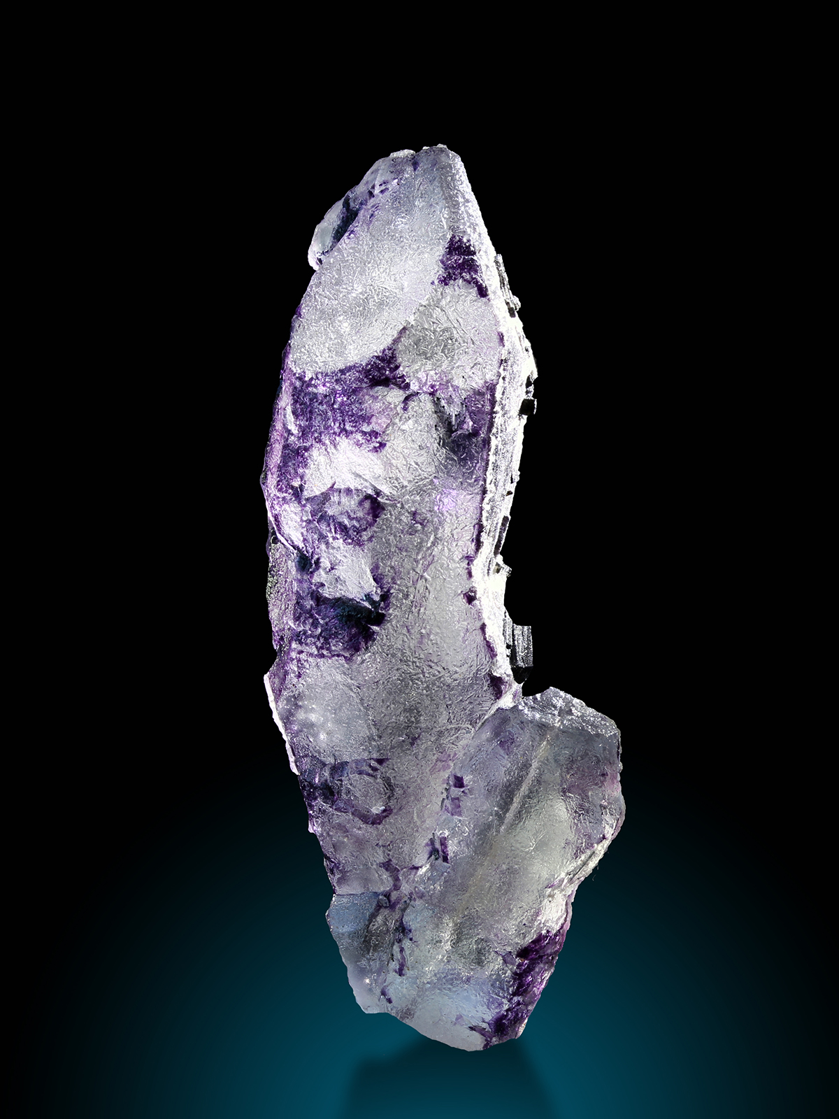 Elongated clear fluorites featuring lovely purple zones on the fringes. Small schorl crystals set a pleasing contrast. No damage.