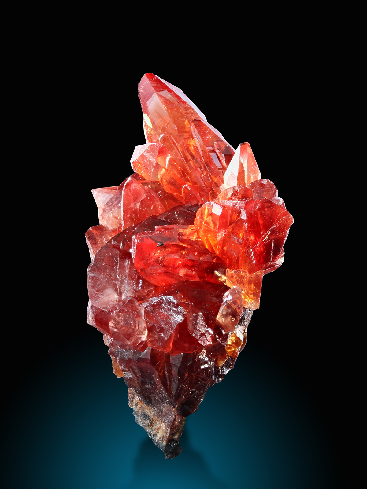 Great cluster of sharp, red and gemmy rhodochrosite crystals on manganese mother rock. From the classic old finds in the 1980s. They still set the standard for the species, no better quality has been found ever since.
