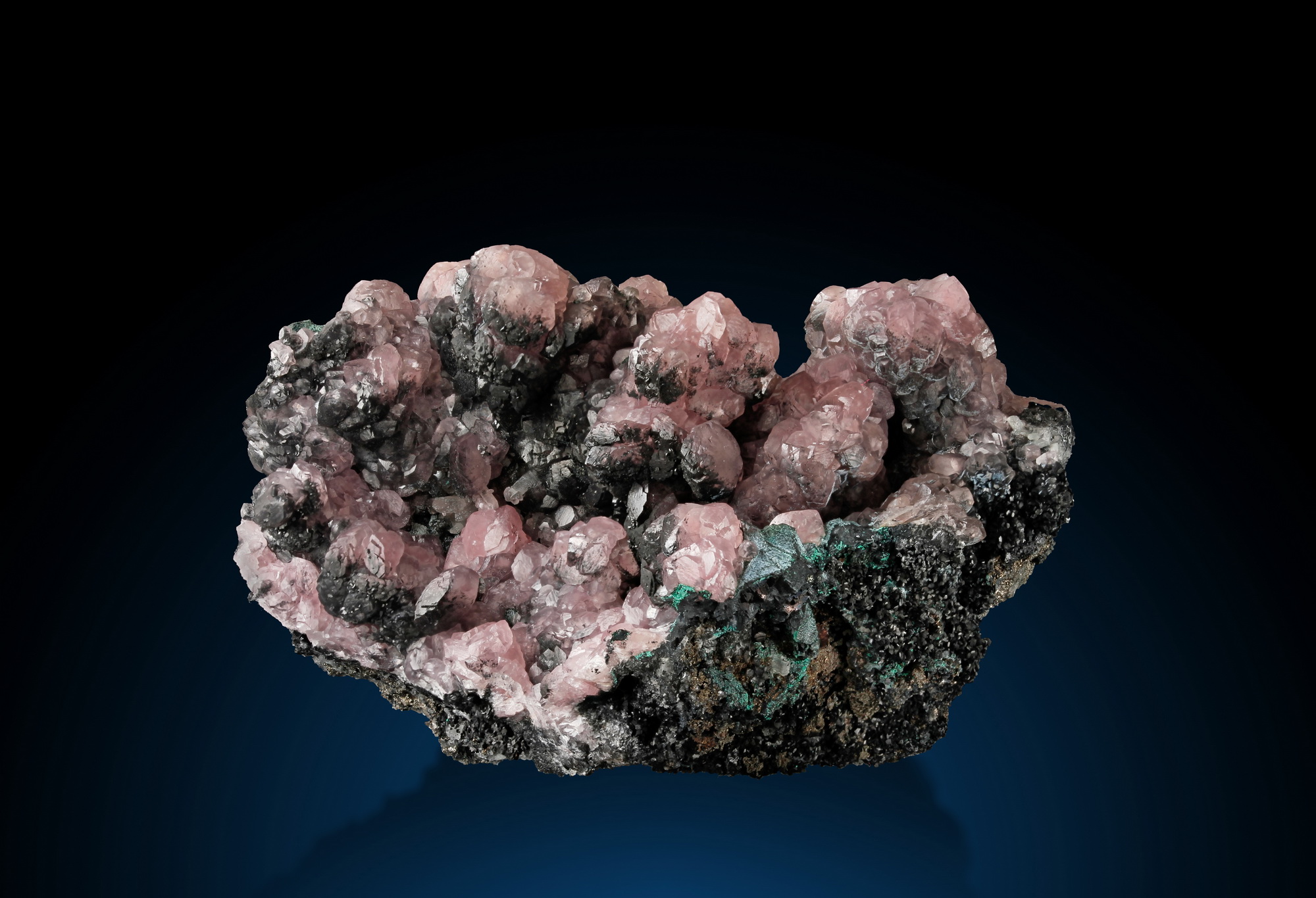 Lovely crystal aggregates of pink cobaltoan smithsonite in rounded ball-shaped, almost stalactitic forms. Malachite-covered tennantites are mixed in and set a beautiful colour contrast. No damage on any of the crystals in the front and center parts. The piece is very 3-dimensional, much more than it appears on the picture.
