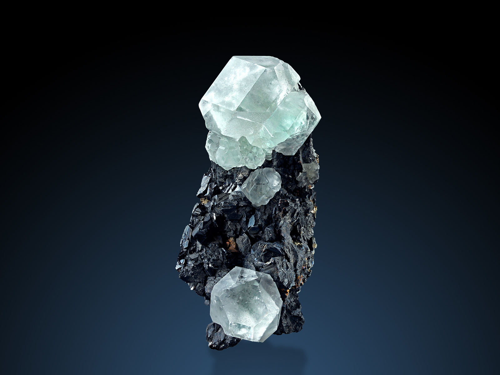A nicely balanced mix of cubic, octahedral and rhombohedral faces gives the fluorites from Naica their distinct shape and character. This specimen features two crystal clusters on a bed of black sphalerites, drawing the eye up and down. No significant damage to report.