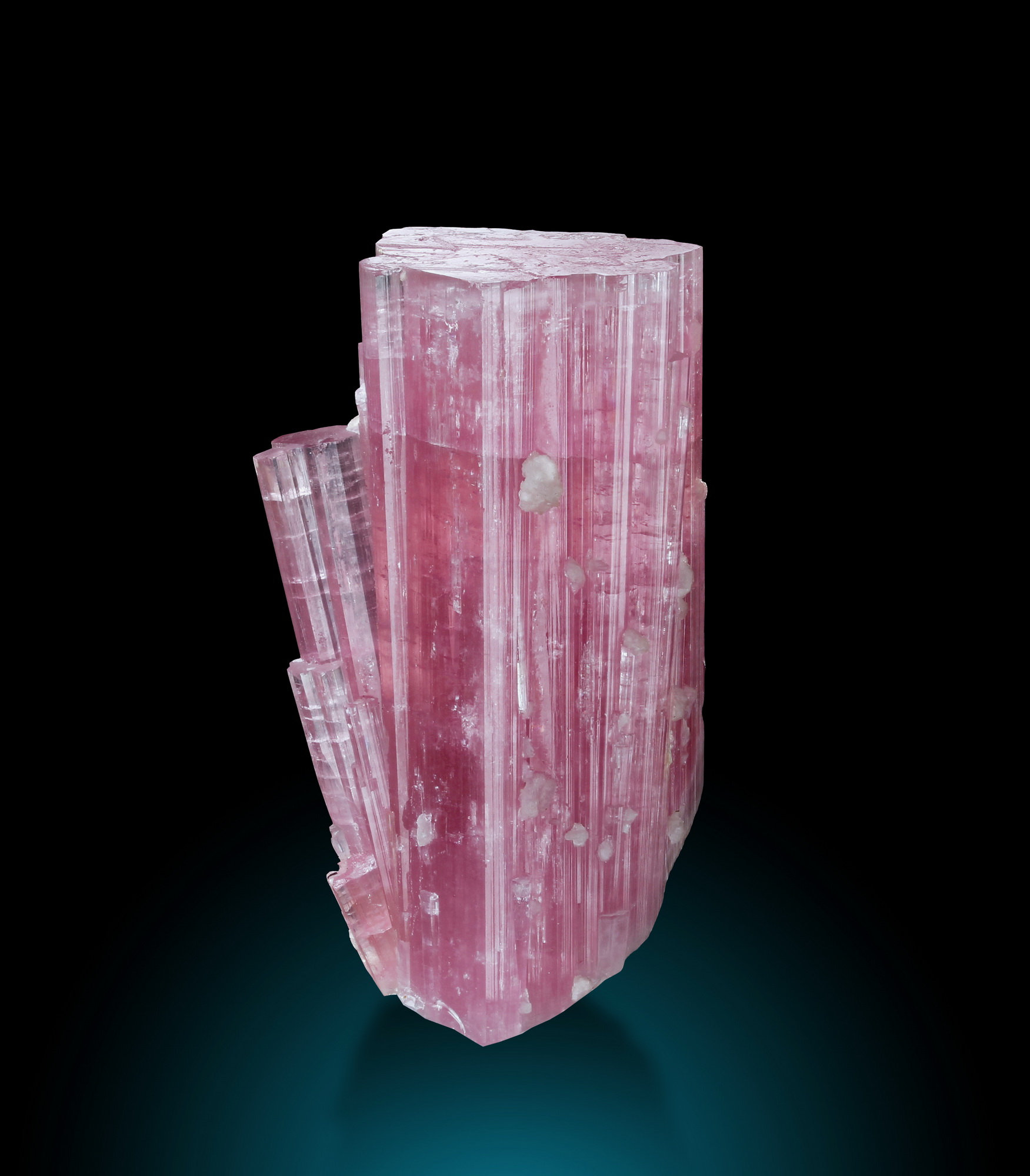 Very intensely pink, now already classic Paprok rubellite with sidecars and lepidolite crystals. No restoration, no damage of significance. The crystal is capped by a thin green layer that is visible at a lower frontal angle.
