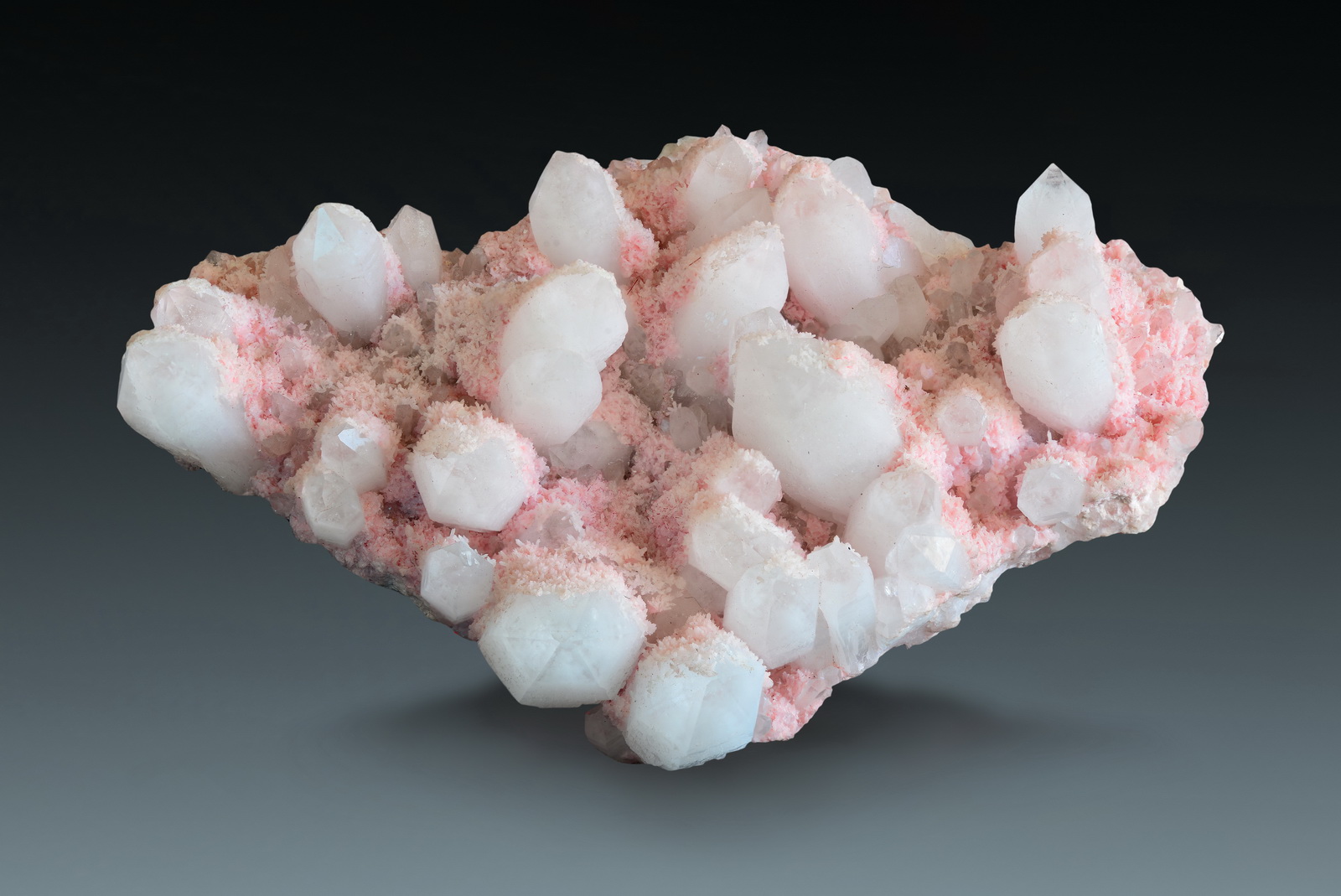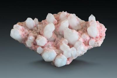 This rhodochrosite specimen shows very nice contrast of colours and shapes! The milky quartz crystals show lovely rounded faces, on most crystals there is no edge between the prism and the pyramidal faces, it is indeed just a rounded curve. They have great luster, too. The rhodochrosite came at a later stage of growth, like pink powder sugar, and sets a very appealing accent. Great condition and shape. Ex Leo Thalhammer collection.