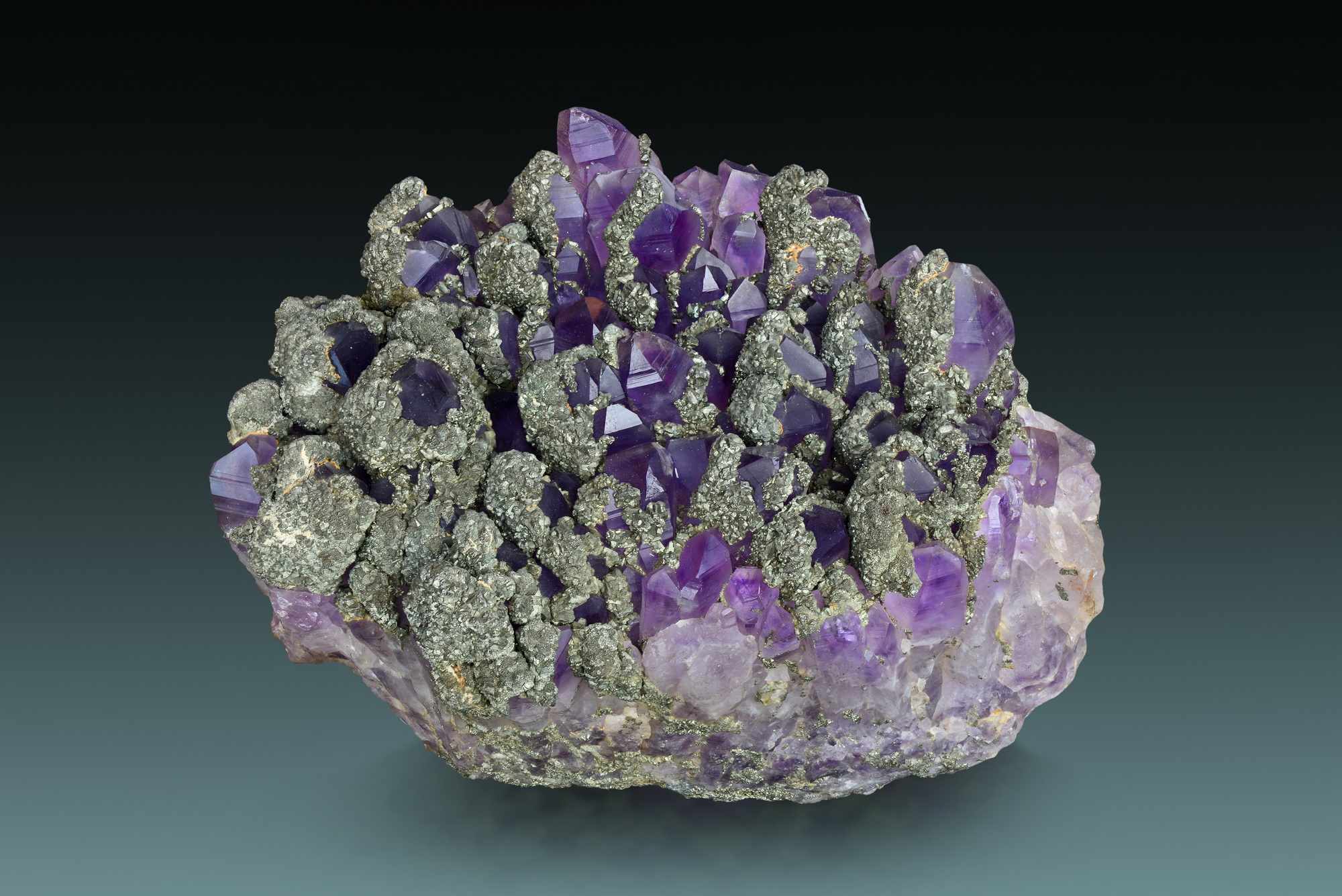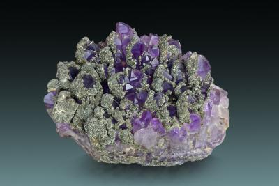 Deeply coloured amethysts nicely capped by marcasite, a combination that is quite unique and typical of Sasar mine in Romania. The piece comes from an old and very limited find, and hence there are hardly any specimens on the market today.