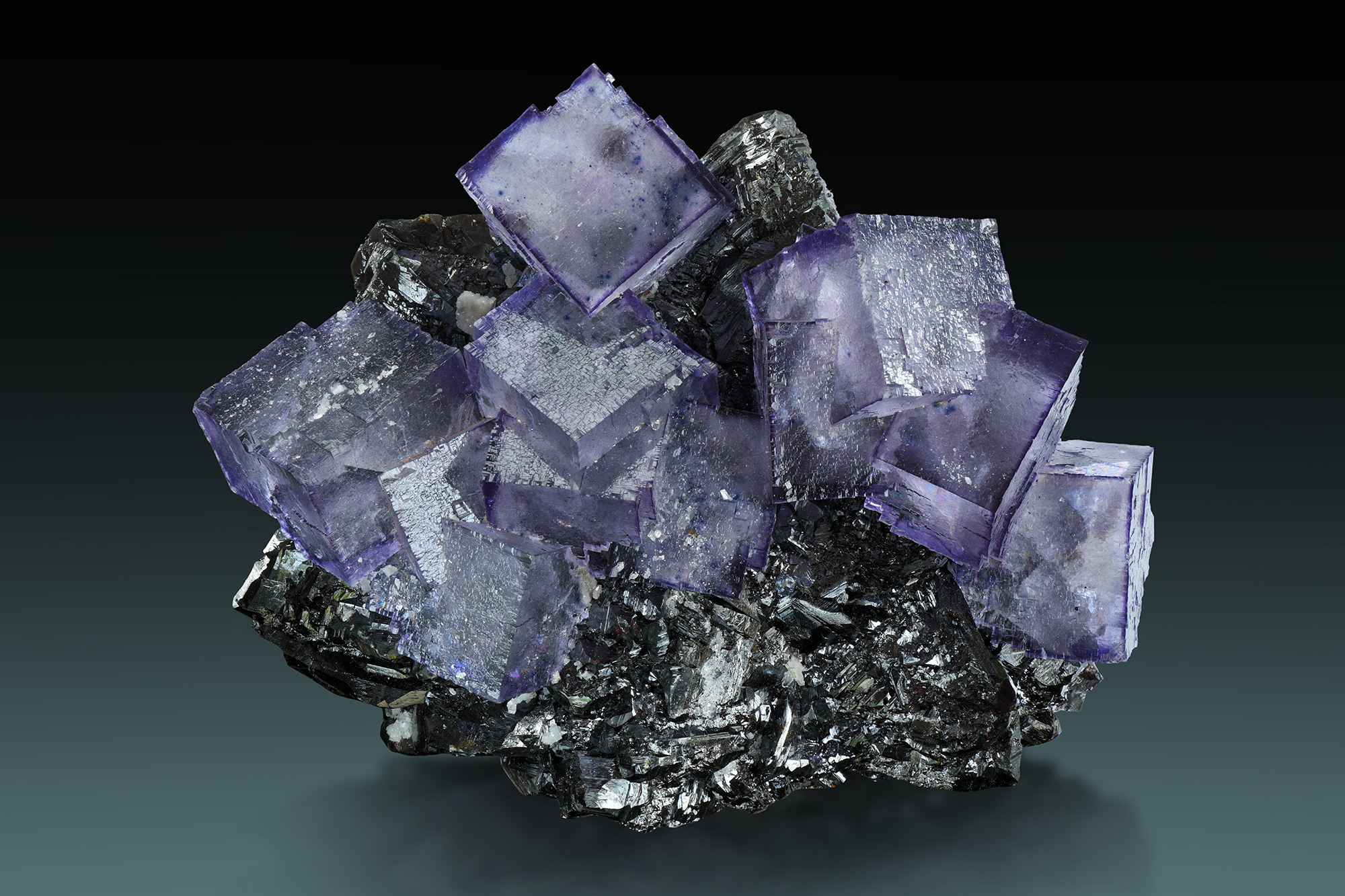 An absolute classic from Tennessee! Gemmy bluish-purple fluorite cubes resting on black metallic sphalerite from Elmwood Mine. The specimen is very well balanced and highly 3-dimensional. As a bonus, the fluorite crystals are more bluish than the more frequent purple ones.