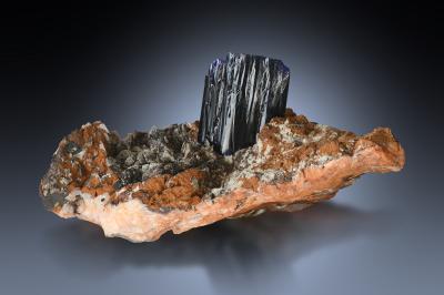 A sharp, stunning azurite crystal protruding out of a contrasting matrix. The aesthetics of this Moroccan azurite is simply phenomenal! Ex Alfred Haas coll.