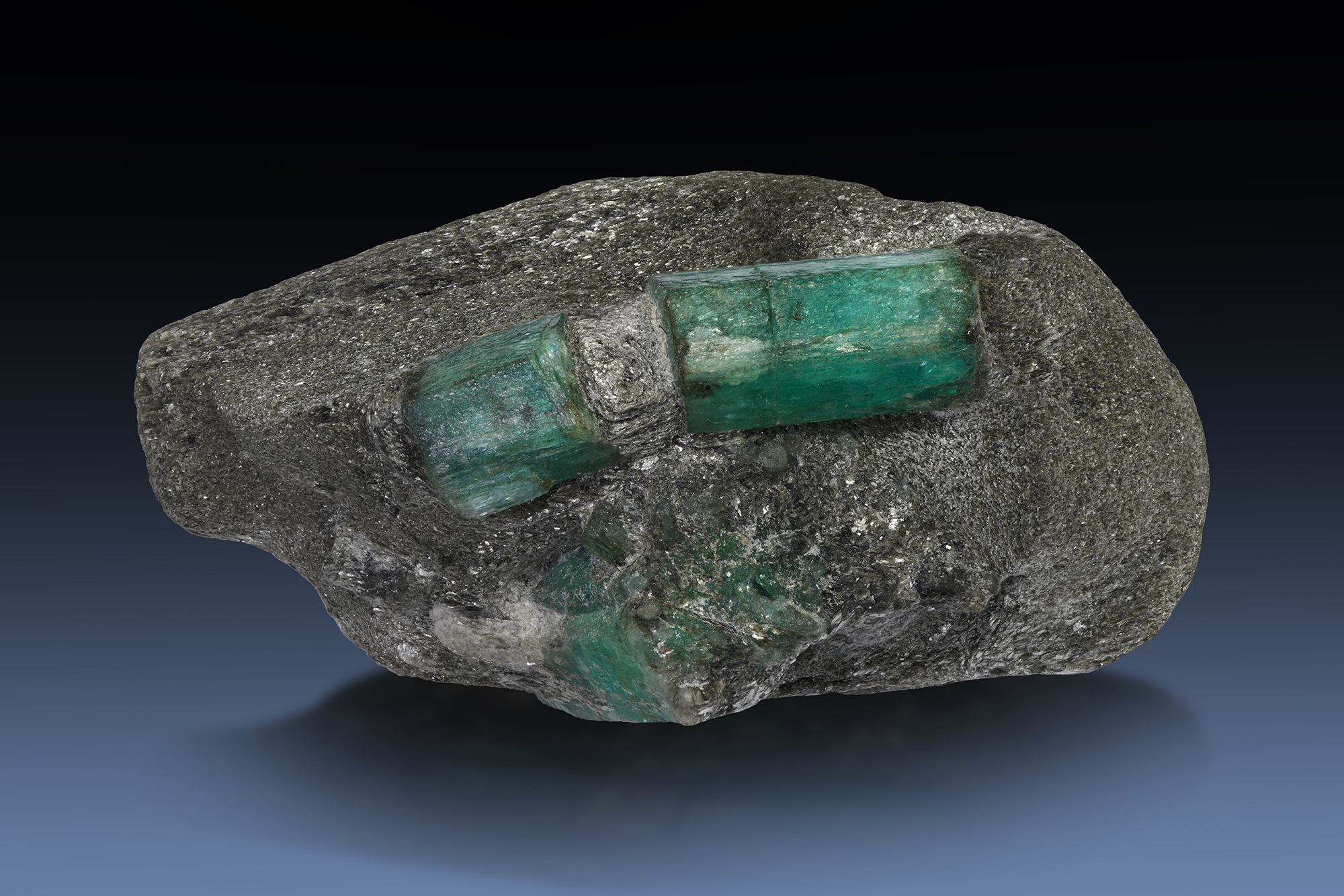 A great example of a Russian emerald featuring dark green crystals embedded in shist. The Russian emeralds have a significant historical importance and are among the most valuable minerals found in the Urals. Due to complications associated with export Russian minerals are becoming more difficult to obtain. This is especially the case with Russian gemstones which are predicted to become rarer on the market in the future. Ex Alfred Haas coll.